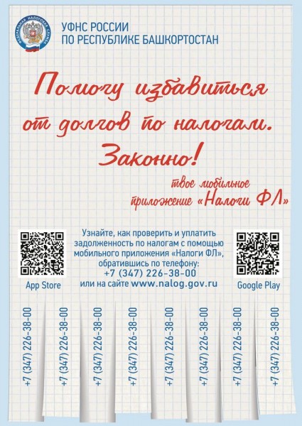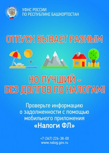 УФНС Росси по Республике Башкортостан организует проведение региональной акции «Лучший отпуск – без долгов по налогам!». Основная задача – информирование населения региона о необходимости заблаговременного уточнения суммы возможной задолженности по налогам и ее оплаты.